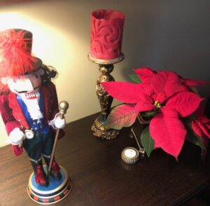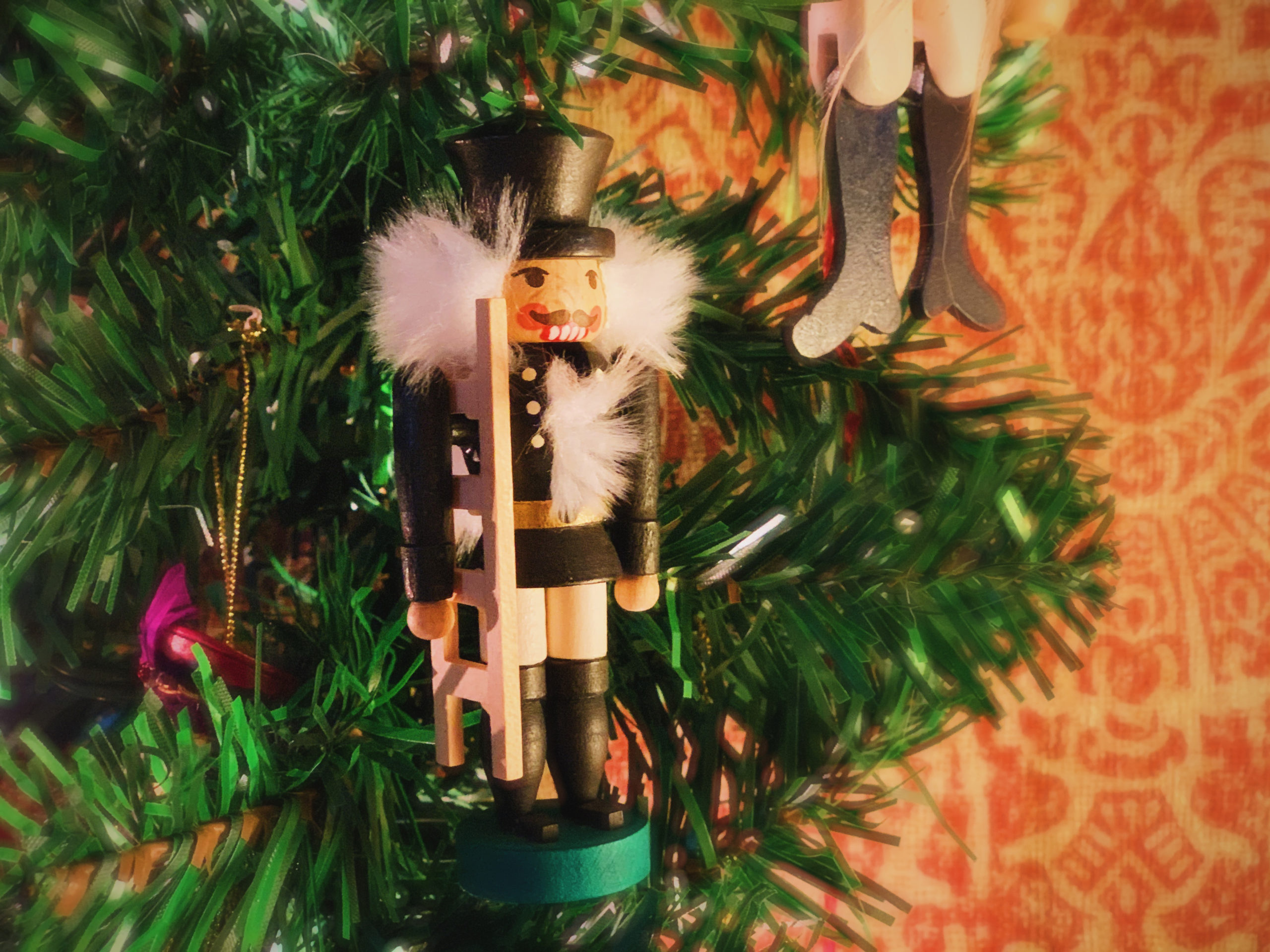 One of my artificial garlands features the nutcracker, toy soldier, and musical ornaments I have collected over the past 30 years. I actually have a houseful of nutcracker ornaments and full-sized nutcrackers. According to German folklore, nutcrackers bring good luck to your family and protect your home. A nutcracker is said to represent power and strength, serving somewhat like a watchdog guarding your family against danger. A nutcracker bares its teeth to evil spirits and serves as a messenger of good luck and goodwill.