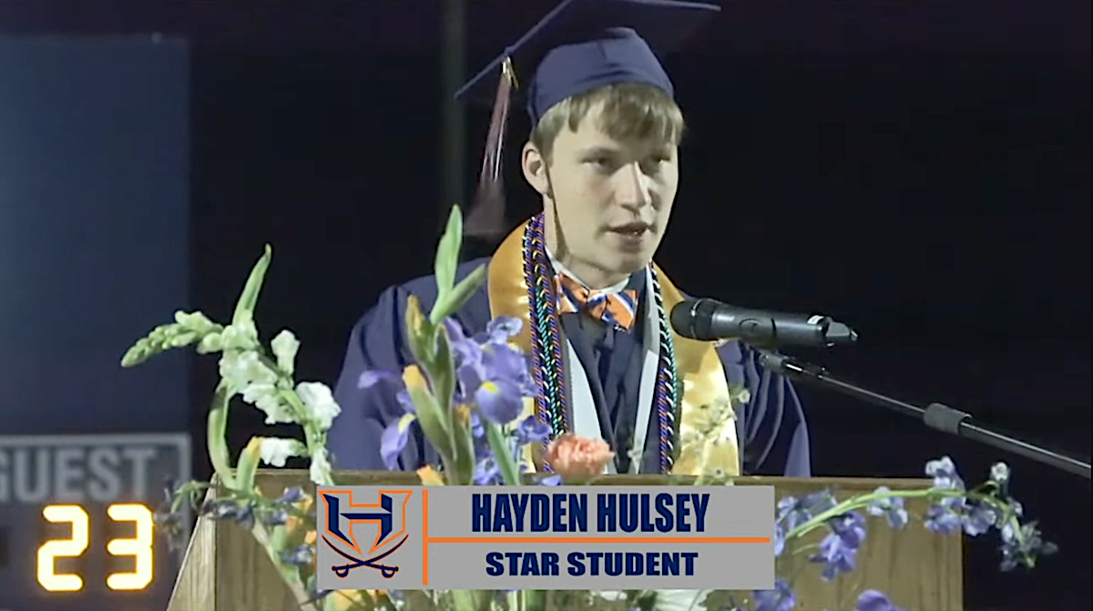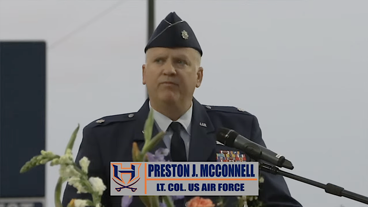 Lt. Col. Preston McConnell speaks to the 2023 graduates at his alma mater. McConnell graduated from Central in 1991 and received this year’s HCHS Lifetime Achievement Award. (livestream image)