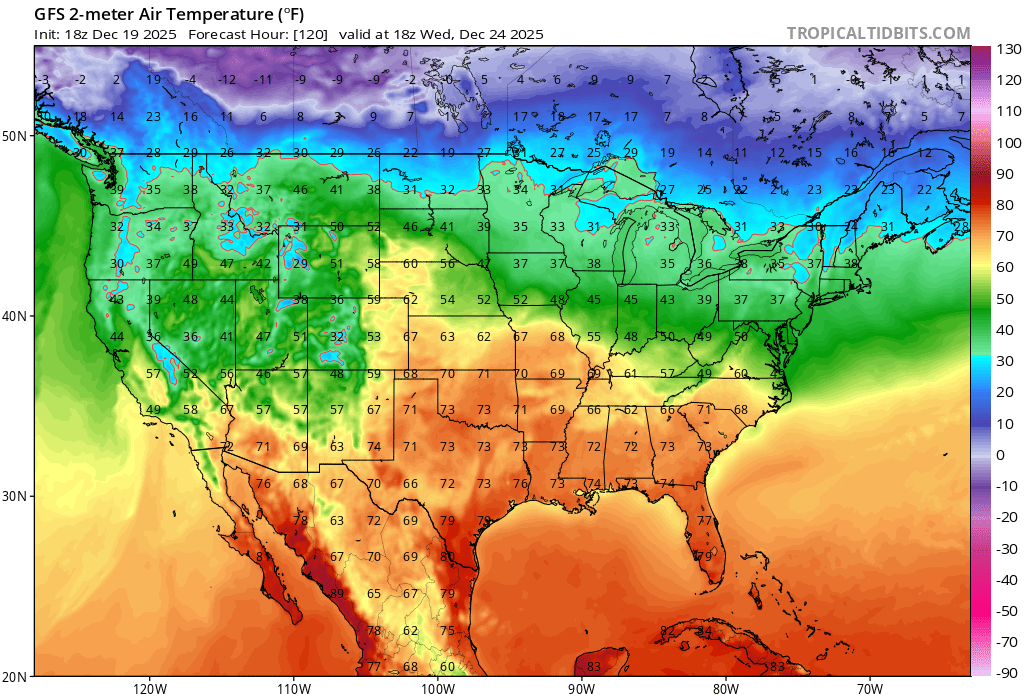 It won’t just be warm here locally, a large ridge will bring well above average temperatures even into the midwest. Highs on Christmas Day will be above freezing for nearly the entire country, although the northern third will remain quite chilly.