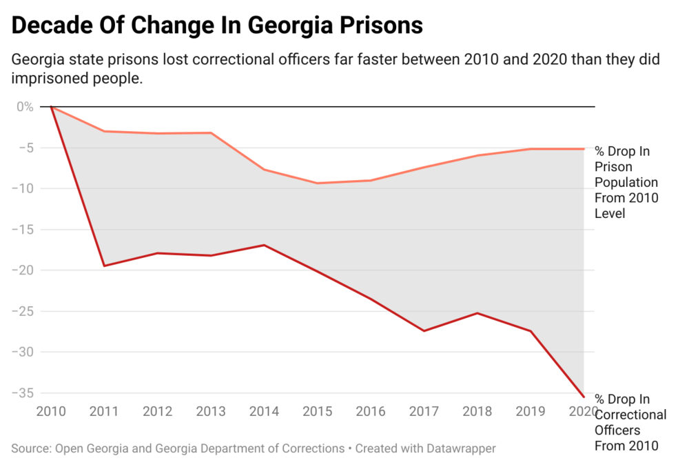 Meanwhile, the number of incarcerated people barely changed and the homicide rate inside Georgia prisons has climbed to four times the city of Atlanta’s.