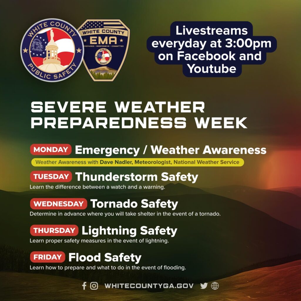 White County Public Safety is observing Severe Weather Preparedness Week by hosting daily livestreams at 3 p.m. on Facebook and YouTube. The livestreams will feature speakers providing crucial information about severe weather safety.