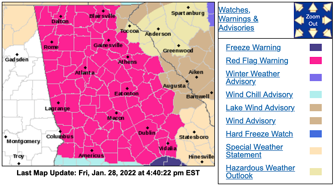 A Red Flag Warning is now in effect for North and Central Georgia from 12 Noon until 7 p.m. Saturday. Forecasters say low relative humidity and high winds will make outdoor burning dangerous.