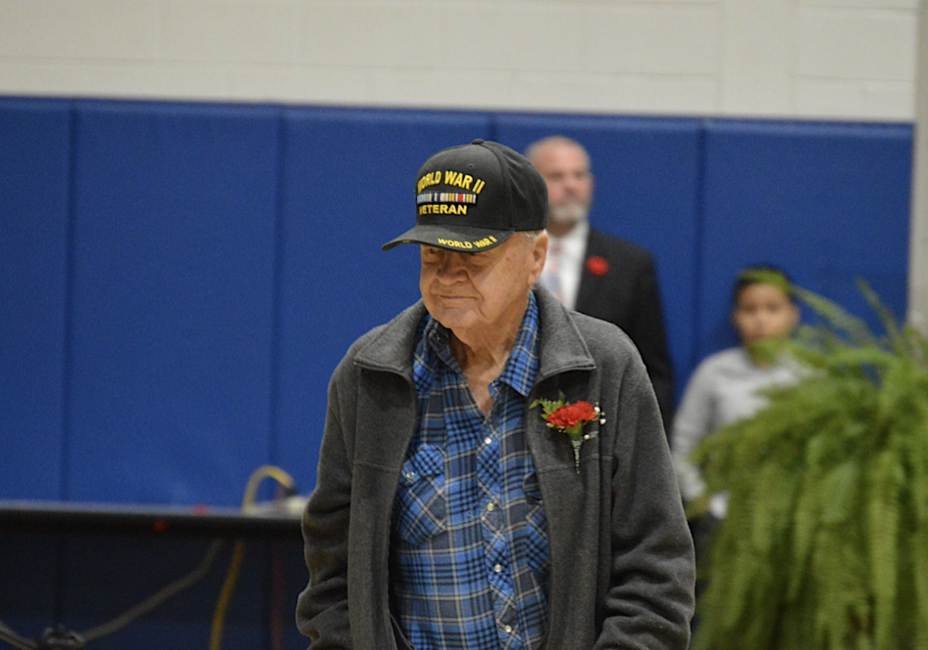 Habersham County School Superintendent Matthew Cooper delivered remarks to an audience of about 200 students, faculty, and parents. He spoke of the sacrifices veterans have made through the years to secure America’s freedom. During his presentation, he recognized local World War II veteran Garnett Burrell. Burrell, one of the few living veterans of that era, was a tank buster during the war.