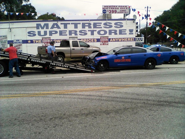 A collision at approximately 2:30 p.m. this afternoon, Monday, Sept. 29, between a Georgia State Patrol vehicle and a green Honda Element disrupted traffic at Cannon Bridge Road and Old Athens Highway in Cornelia as both vehicles were loaded onto tow trucks to be removed from the scene.