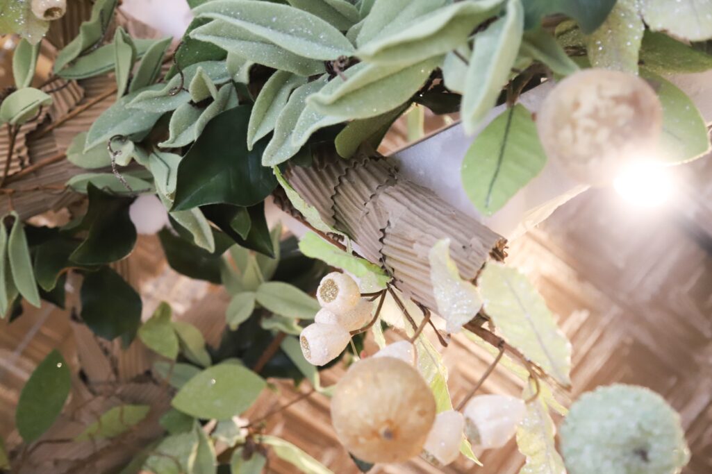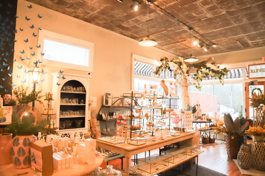 The shop pops with handmade finishes, like the tree branches she’s made and furnishes with seasonal leaves and flowers, made from pool noodles and cardboard. Harkness says that she likes to “take the ordinary and make it extraordinary” in her shop.