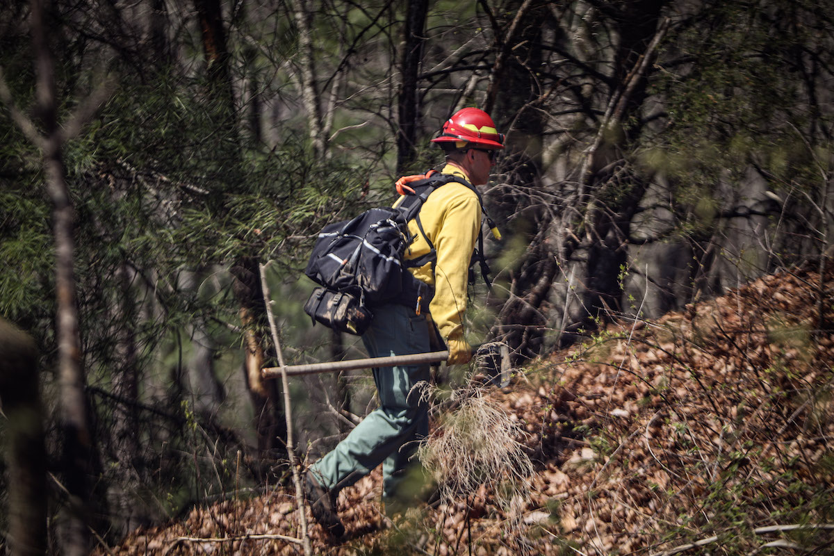 With the mutual aid units gone, about a half dozen firefighters still on the scene quickly flew into action when the Tatums noticed a flare-up in the woods next to their home.