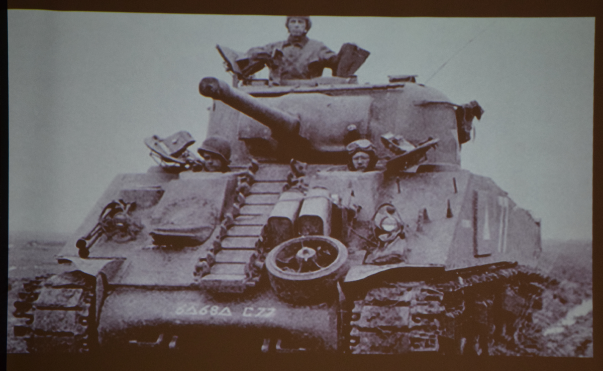 Once in Wales, he was assigned to the 128th Field Artillery of the 6th Armored Division. During his initial training, he was trained as a clerk typist. He told the audience once he got overseas, he never saw a typewriter and had to learn a whole new job.