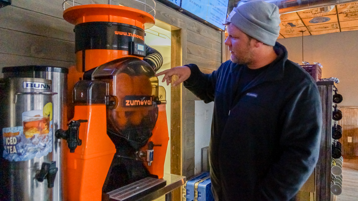 Co-owner Ben Lucas shows off the cafe’s orange juice squeezer, one of his favorite appliances at Yonah. (Hadley Cottingham/Now Habersham)